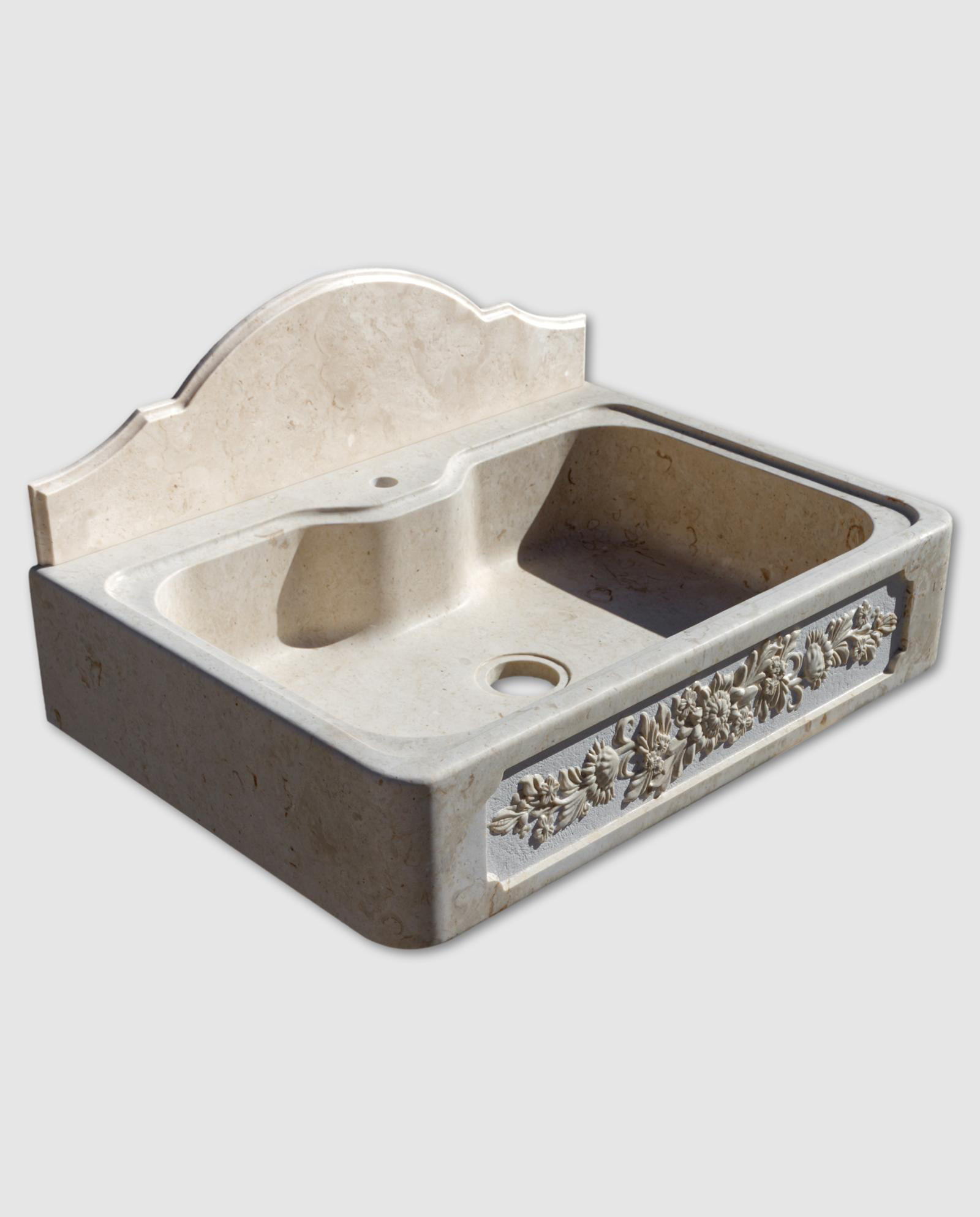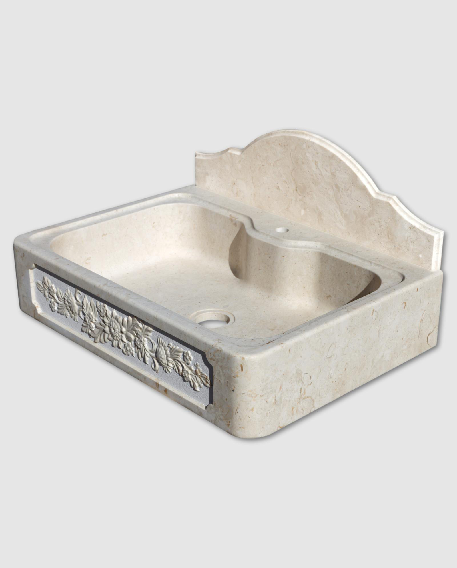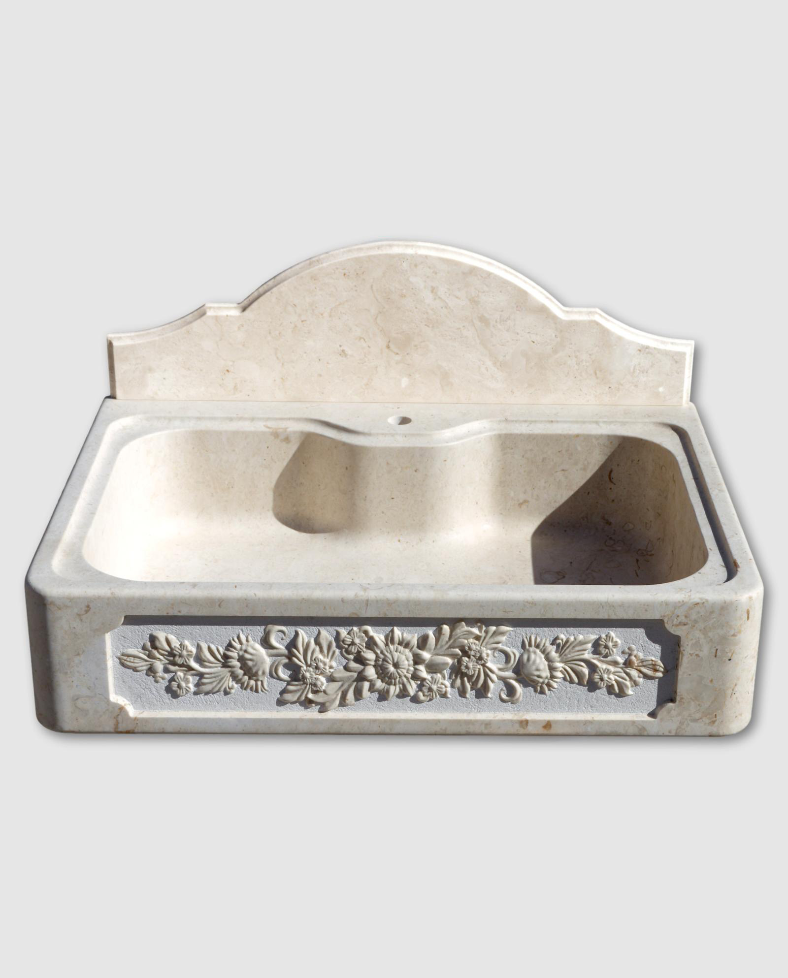 Lavandino in pietra cappuccino mod. Fior di Sole con una vasca e ornamento scultura “girasoli” e alzatina paraschizzi