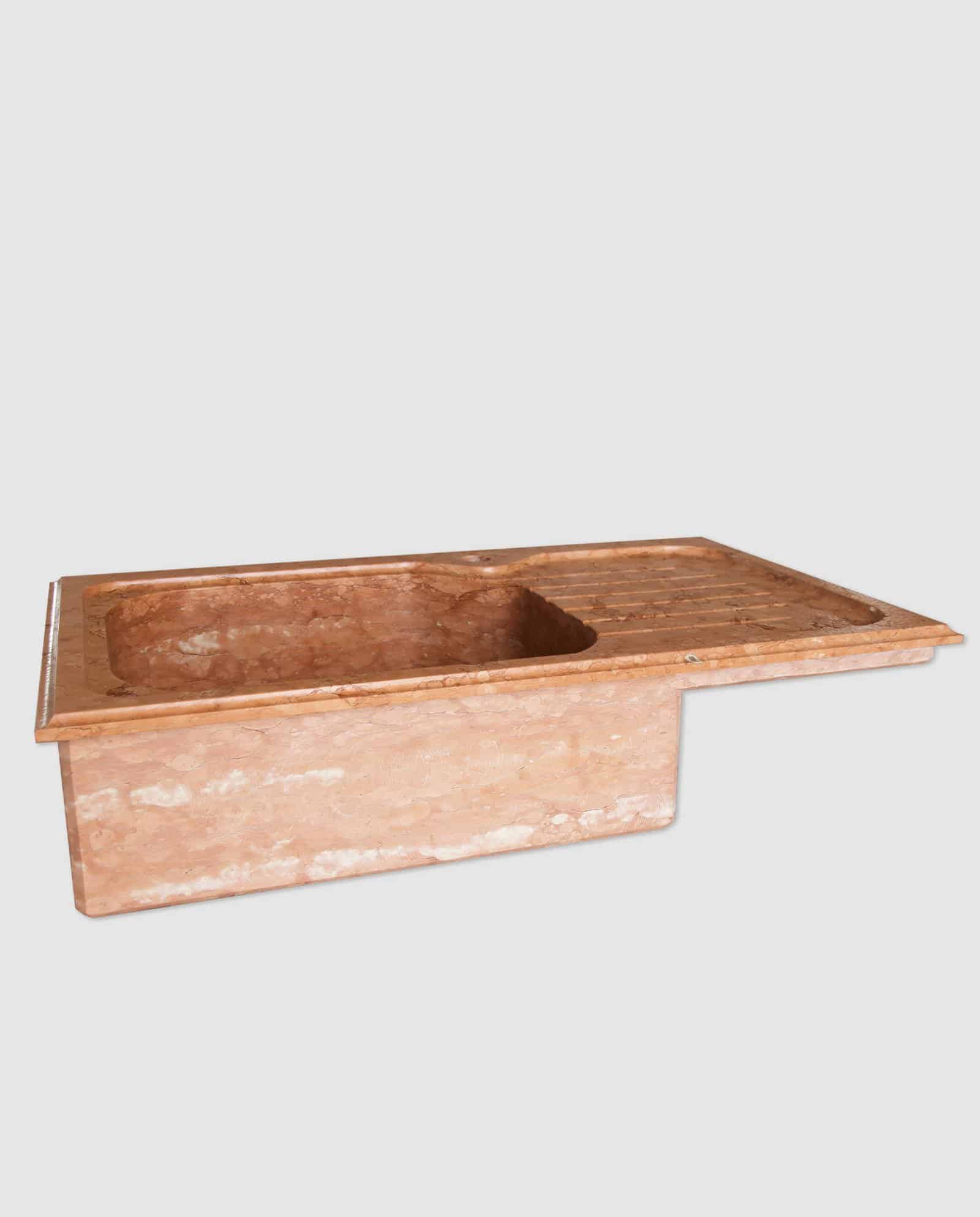 Lavandino in pietra rosso Castellammare mod. Mothia con una vasca e gocciolatoio scolapiatti e lavorazione da incasso con incavo per alloggio lavastoviglie